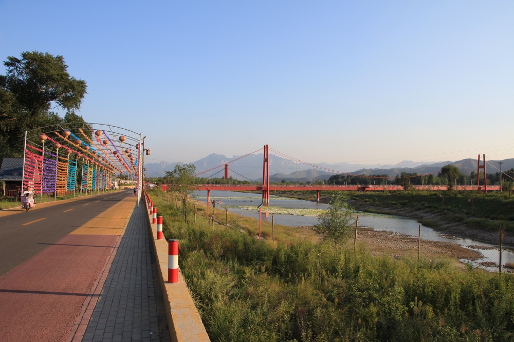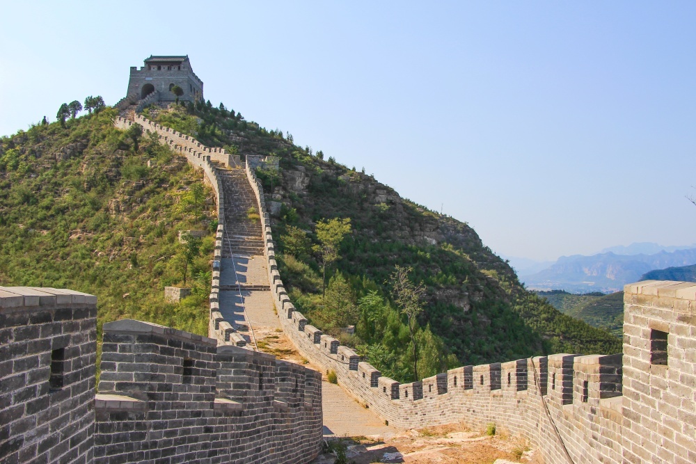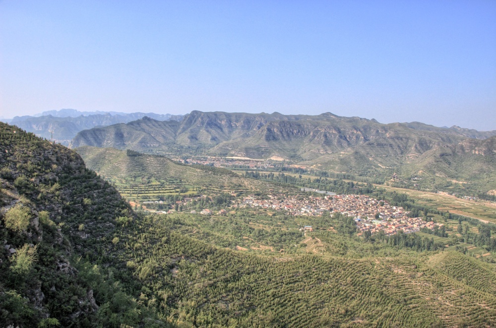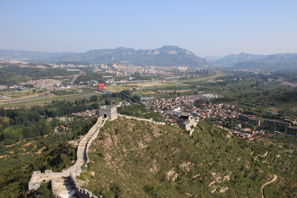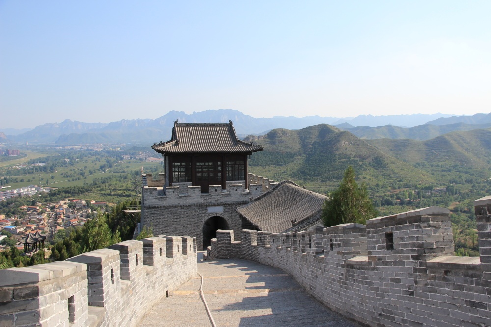 Po obědě obcházíme park po silnici, která vede přímo k turniketům, což je velká zkratka. Prodavač samozřejmě neumí anglicky, ale předtím X na kalkulačce naťukal cenu 10 juanů (osoba 30 korun, to je fajn). Po projití do areálu zjišťujeme, že rumělková skála je falešná. Dokonalá napodobenina. Stoupáme po kamenných cestičkách nahoru, po mostcích až dojdeme k altánku. Od něj nahoru na první věž. Nevypadá to celé moc staře, pomyslím si. Asi to postavili teda ti vojáci na obranu města. Hradba se vine výš a výš a je tvořená kamennými schody. Ve věžích jsou krátká schodiště, takže se dá vyjít nahoru a rozhlédnout se po okolí. Město, vyschlé zarostlé koryto řeky, hory kolem dokola. Je to pěkné. Divíme se, že při takové suché půdě je tu vše zelené. Hory jsou skalnaté a vyprahlé. Nikoho tu nepotkáváme. Pár plastových lahví leží na zemi nedaleko odpadkového koše. Vycházíme na další hřeben a další. Po čtvrté věži následuje vyvrcholení celé stavby. Plošina, na které stojí lešení s kladkou nahoře a ženská, která tam sedí s vlčákem! Aha, takže ono to není dostavené. Toť zakončení naší veleočekávané cesty. X se ji ptá, kolik je hodin. Rukama nohama jí to vysvětlí. Máme hroznou žízeň a tak hltáme už teď teplou vodu. Cestou zpět vidíme letopočet na schodech hradby – 2017. V parku pod ní je 2014. Takže dokonalá atrapa. Žádná památka, nýbrž turistická atrakce.