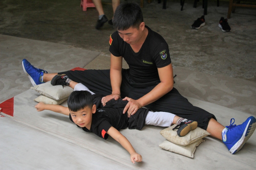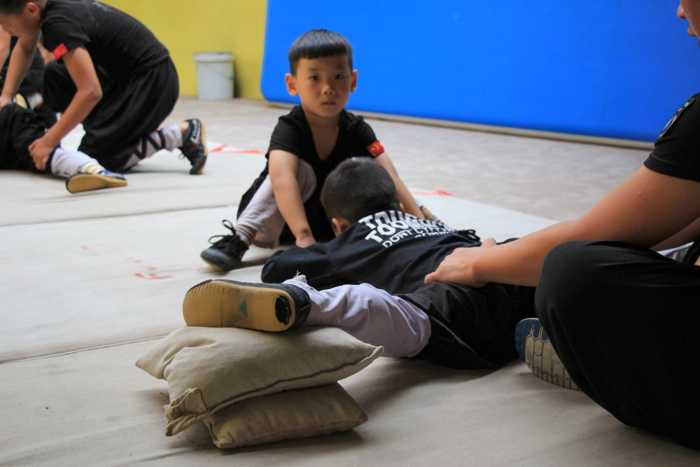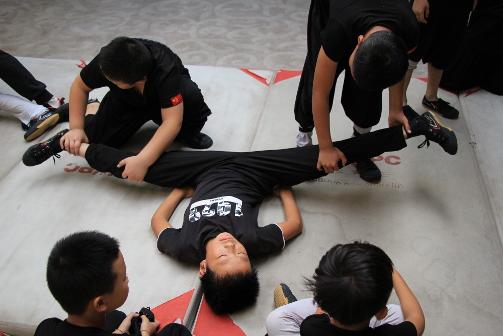 Státní svátek. Dnes je tedy státní svátek. Trénink malých šaolinů. Po snídani jsme na Power Stretchingu nebyli sami. Přidalo se k nám asi 20 malých klučíků, věkem různě prvního stupně základky. Nejdřív jsme různě běhali a skákali do kopečka, nosili se, dělali trakaře, z čehož se mi zase motala hlava. Uvnitř začalo protahování šlach. Řekla jsem, že to dělat nebudu. Tak jsem držela nataženou nohu ležícímu šaolinkovi a koukala, jak neskutečně ohebné je dětské tělíčko. Druhou nohu mu chytili kamarádi a pomalu ji jako hodinovou ručičku posouvali směrem k hlavě, až k uchu! Tu nohu mu vlastně posunuli o 180 stupňů! Pak zase šla natažená noha k hrudí nebo rozštěp atd. Taky dělali skoky hlavou nazad. Děti neřvaly, když je to natahování bolelo, čínsky si odpočítávaly a bolest zadržovaly. My řvali jak tuři a tekly nám slzy, za což se nám mistr smál.