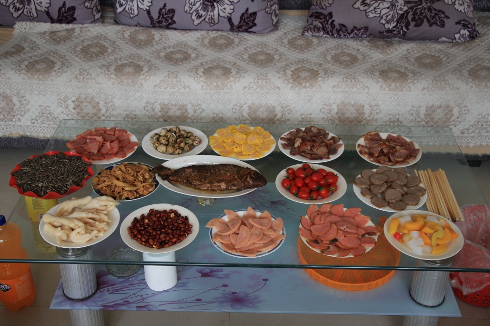Znovu několik druhů přesoleného masa, ryba, křepelčí vejce, rajčata, kuřecí pařáty, pražené arašídy, kandované ovoce, limonády. Znovu žádné koláčky (moc mi zachutnaly).