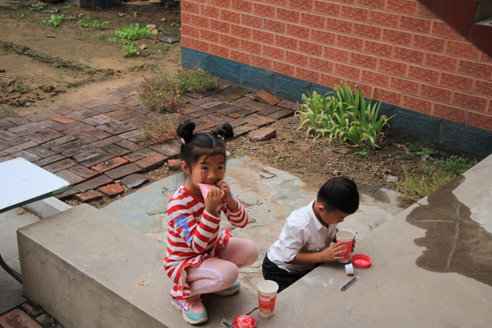 Sedí tam s námi ženy a mistr. Jedna tlustá se s námi fotí. Pak se s námi venku fotí další a natáčí video. Jdeme se najíst. U růžového masa nám mistr poví, že je to „dog“. Aha, říkám si, tak tohle psí maso jsem už snědla, nedá se nic dělat. Potom ale napodobí kachnu. Oni totiž nerozlišují slovo „dog“ a „duck“. Pak hovězí, oslí a nakonec křehká ryba, která se vaří prý 8 – 10 hodin a jejíž kostičky se rozpadají. Nikdo neumí anglicky. Pak si hrajeme s dětmi na dvorku. Už nás to tam nebaví. Je tam asi dvacet lidí, ale nic tradičního. Okolí je ošklivé a páchne. Lituju toho, že jsem jela. X taky. Nejradši bychom se viděli na kolech. Jenomže nás pozval a odmítnutí by bylo nevhodné a taky jsme nevěděli, co nás čeká.