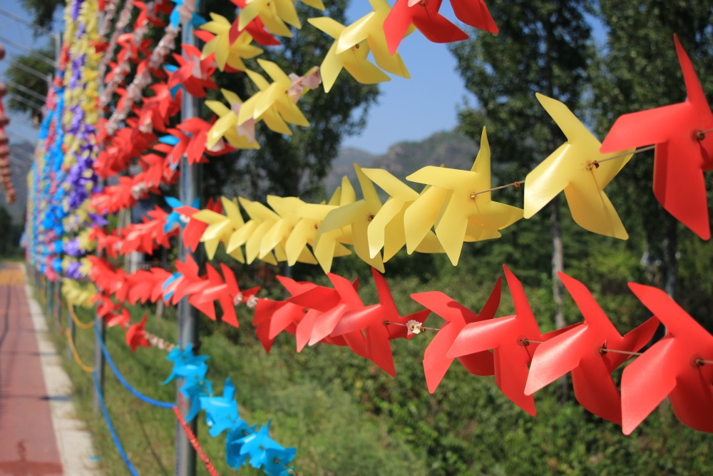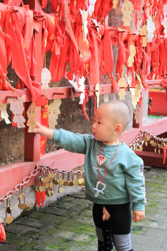 Uvnitř svatostánku je v každém patře oltář s božstvem a obětinami. Jsou jimi třeba panenky, ovoce nebo prostě sladkosti. Kolem jsou hory, vlevo ta kabinová lanovka. V jedné budově si můžete zabubnovat, ve druhé zazvonit na velký zvon. Na nádvoří plandají ve vzduchu červené stužky přivázané na větvích stromu. Stužky jsou i vedle na dřevěné konstrukci. Nejspíš jsou to nějaká přání, modlitby lidí. Také tam jsou zámečky. Přemýšlím o tom, jestli tam dole máme ještě kola. Sestupujeme dolů, X fotím s vousatým chlápkem a chlápkem hrajícím na podomácku zhotoveném erhu. (?)