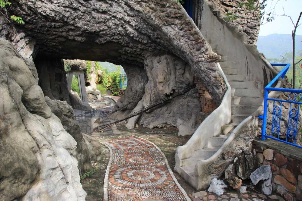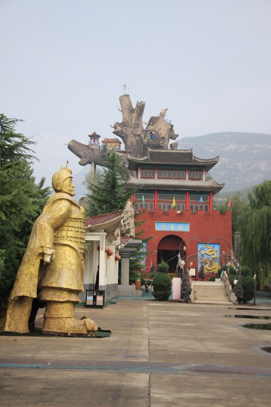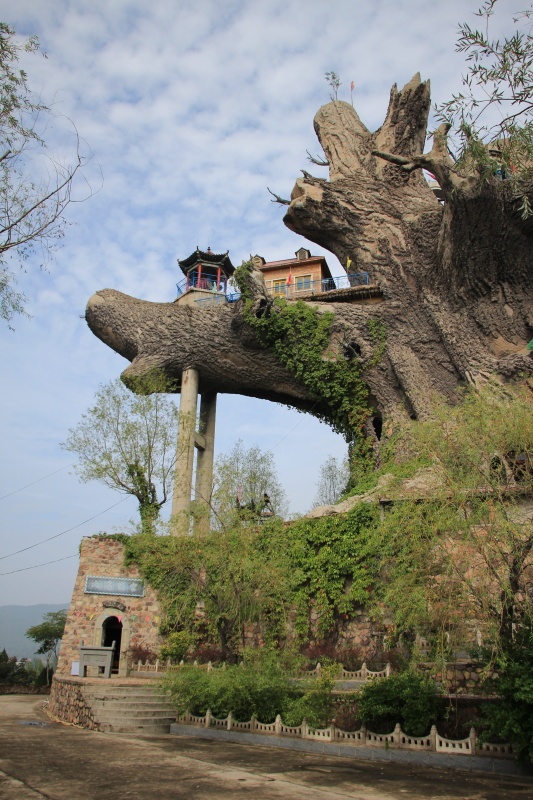 Uvnitř je to takové sešlé, ošuntělé a neudržované. Jsou tu otřepané plastové vánoční stromky, postavičky šmoulů, kačera Donalda a tak. Je to takový čínský kýč. Jedna budova je úplně zavřená. Před námi je červená několikapatrová svatyně, uvnitř které je socha. To obcházíme a konečně. Před námi se na kopečku tyčí tisíciletý titánský strom. K němu vedou schody a na konci je brána. Vystoupáme ke stromu a zblízka zjišťujeme, že je celý betonový! Dokonalá napodobenina struktury stromu i kůry. To ale nekončí. Dovnitř vedou několikeré schůdky. Vnitřek je také vybetonovaný, na každém podlaží je nějaké sedící božstvo, malby na stěnách, předměty ve vitrínách atd. Je to vlastně několikapatrová svatyně. Naznačuje to už jméno „Pagoda Tree“. Prostory uvnitř jsou velké. V každém patře je vyhlídka. Vystoupáme až nahoru a vyhlížíme do dáli. Viditelnost je ale špatná. Je zataženo a opar, špatné počasí pro fotografa. Dole zjišťujeme, že strom je z roku 2002. Tak je z něj aspoň něco pravého?