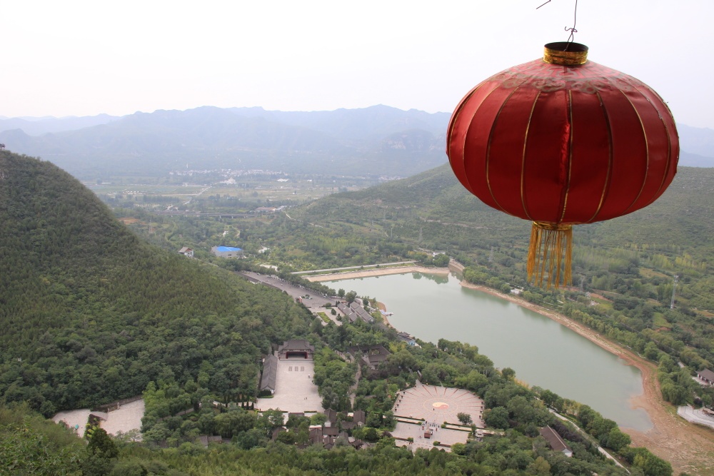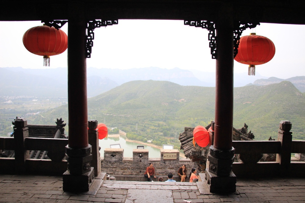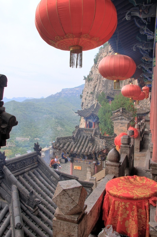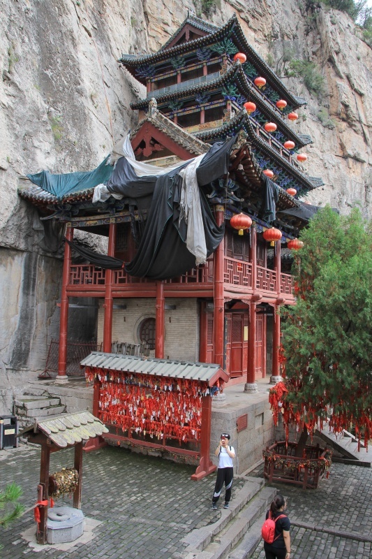 Nemám širokoúhlý objektiv, takže hledám správné úhly a místa, abych to stísněné místo nafotila. Lidé sedí na zídce, v malé „peci“ zapalují tyčinky a kolem stoupá kouř. Na hlavní budově svatyně visí červené lampiony. Ve skále jsou dva výklenky se sochami z roku 500. Takže areál nebude o moc starší. Všude visí červené lampiony, je odtud krásný výhled do okolí. Je to tady pěkné, i přes tu ohavnou fólii zakrývající střechy. Asi nemají zrovna peníze na opravu, ale tohle je právě ten kus tradiční Číny, který jsem chtěla vidět! Něco o historii paláce: