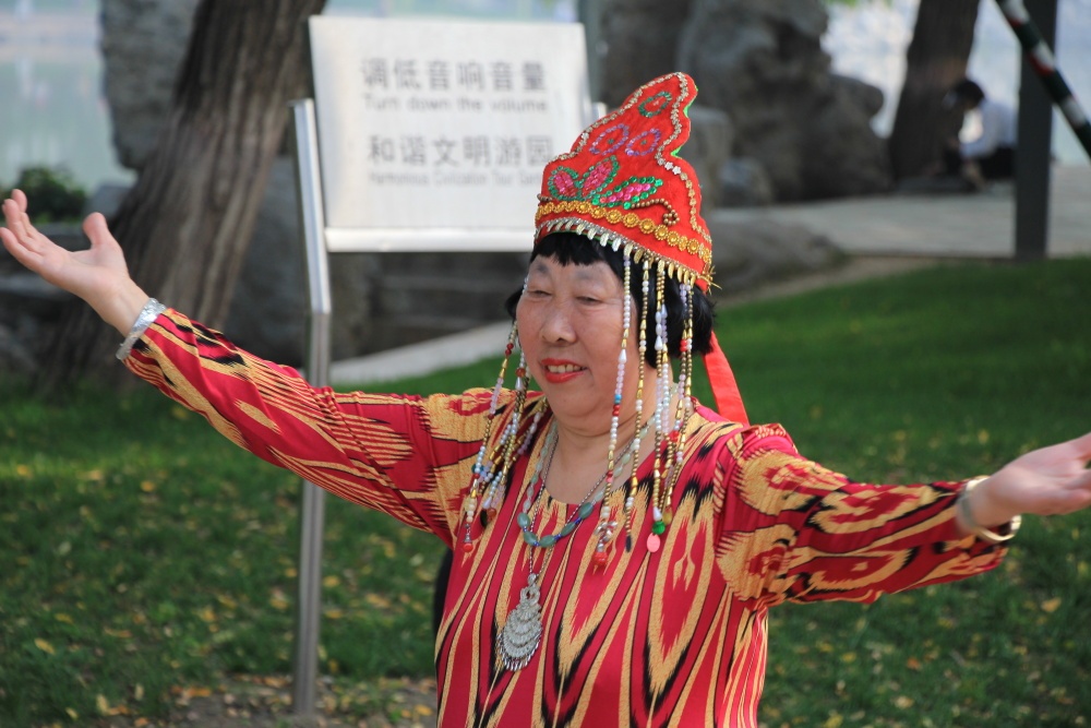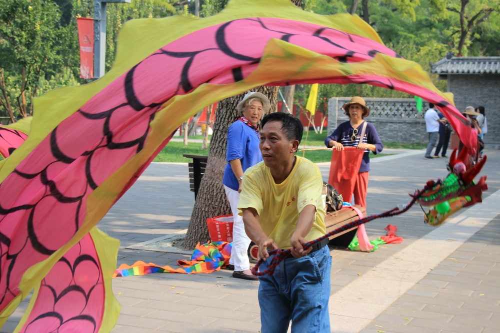 Po procvičce na to jdeme: 24 kroků tai-či, Long Fist a Five Steps. Přitahujeme pozornost, ono aby ne, žádný cizinec tu není! Jen my. Xka zaujme chlapík tancující se stuhou. Tak to zkouší taky. Chlapík mu dává instrukce jak s tím mávat a točit a nakonec mu to jde, až se u toho pěkně zpotí. Park jsme si opravdu užili, myslím tu atmosféru a jak tu lidé jsou aktivní a přátelští.